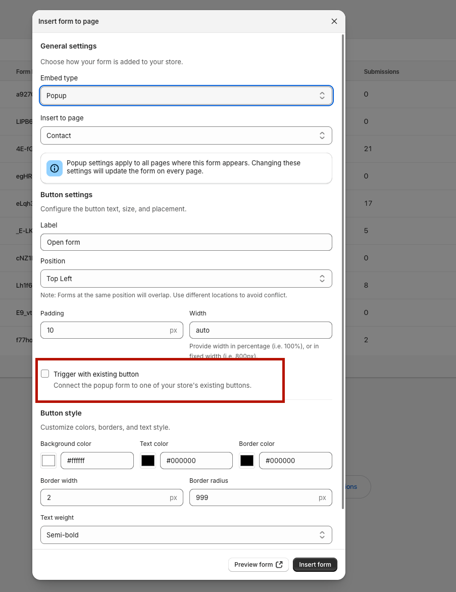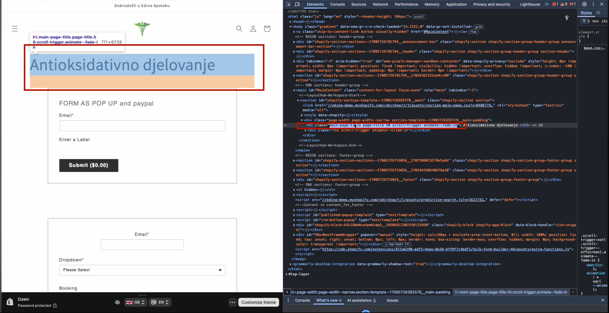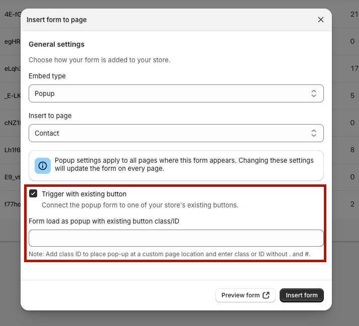 Select where you want the form button to be among the 4 position options or place it anywhere in the page by choosing Custom placement option. You can place the form as a popup anywhere in the page by going to the storefront, clicking Inspect and then copying the class id into the Class ID field. When placing a form as a popup button on a custom part of your page, first right-click and select Inspect. Then, hover over different parts of the code to see them highlighted on the page. This helps you confirm you've selected the correct section. From the highlighted div class, copy only the text within the quotation marks up to the first space, and paste it in the Class / ID of Position field.