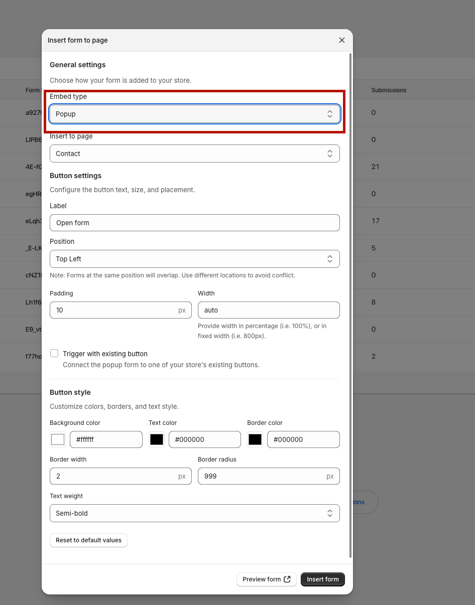 Pop-up setup is now found directly on the Forms page: click Insert to page → Pop-up (alongside the Inline embed option).